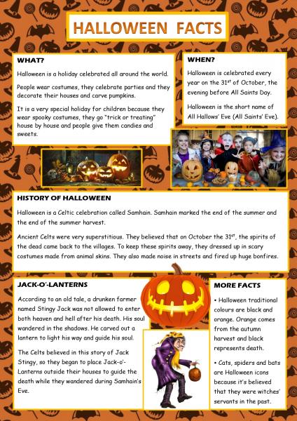 Halloween FactsVersión en línea Reading and comprehension activity. por Carolina Ruiz Marcos 1 When do we celebrate Halloween? Write the exact date. Written answer 2 What is the name of the activity consisting of going house by house collecting candies and toys? Written answer 3 What did ancient Celts do to protect their harvest? a Ancient Celts went to bed very early. b Ancient Celts dressed up with scary costumes made of animals. c Ancient Celts didn't have any harvest. 4 Mark TRUE or FALSE. Today, Jack o’ Lanterns are decorative pumpkins. a TRUE b FALSE 5 Choose the correct answer. Halloween traditional colours are... Choose one or more answers a White, black and grey. b Orange and white. c Black and orange. 6 Choose the correct option. What is the connection between bats and spiders with witches? Choose one or more answers a Bats and spiders are witches pets. b Bats and spiders were witches servants in the past. c Bats and spiders are witches friends. Feedback 1 31st of October
