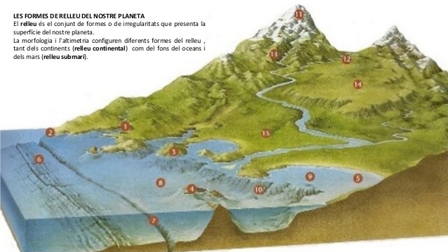 Les formes de relleu (D)Versión en línea Indica en el mapa les formes de relleu por Jordi Franch Pons 1 Ria 2 Cap 3 Península 4 Illa 5 Golf 6 Dorsal oceànica 7 Fossa marina 8 Plana abissal 9 Plataforma continental 10 Talús continental 11 Muntanya 12 Depressió o conca 13 Vall 14 Altiplà 15 Plana