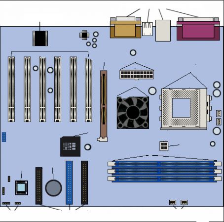 Mother board o Tarjeta MadreVersión en línea La siguiente actividad consiste en ubicar cada uno de los componentes o partes de la tarjeta madre según lo visto en la guía de estudio. por Heidy Montano 1 Chip de Audio 2 Conectores de entrada y salida 3 Ranuras de Expansión PCI 4 Ranuras AGP 5 Conector del suministro de energía de la placa madre. 6 Soporte del procesador 7 Conjunto de chips (1) 8 Conjunto de chips (2) 9 BIOS 10 Bateria CMOS 11 Conectores de unidad de Disco y Disquette 12 Conectores de la RAM 13 Conector del suministro de energía al procesador 14 Conector del suministro de energía al gabinette