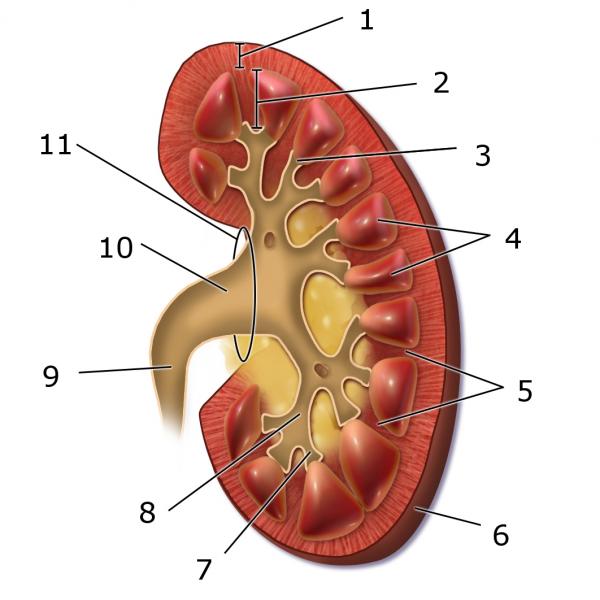 Partes del RiñónVersión en línea Ubicar las partes del riñón por Melany Guamanquispe 1 Corteza Renal 2 Médula Renal 3 Papila Renal 4 Pirámide Renal 5 Columna Renal 6 Cápsula Fibrosa 7 Cáliz menor 8 Cáliz mayor 9 Uréter 10 Pelvis Renal 11 Hilio Renal