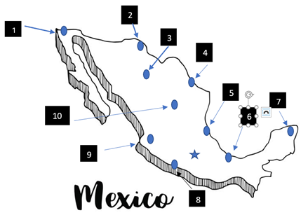 Mexican citiesVersión en línea Locate the main industrialized Mexican cities por gregory mendez 1 Tijuana 2 Cuidad Juarez 3 Chihuahua 4 Nuevo Laredo 5 Tampico 6 Veracruz 7 Merida 8 Acapulco 9 Guadalajara 10 Monterrey