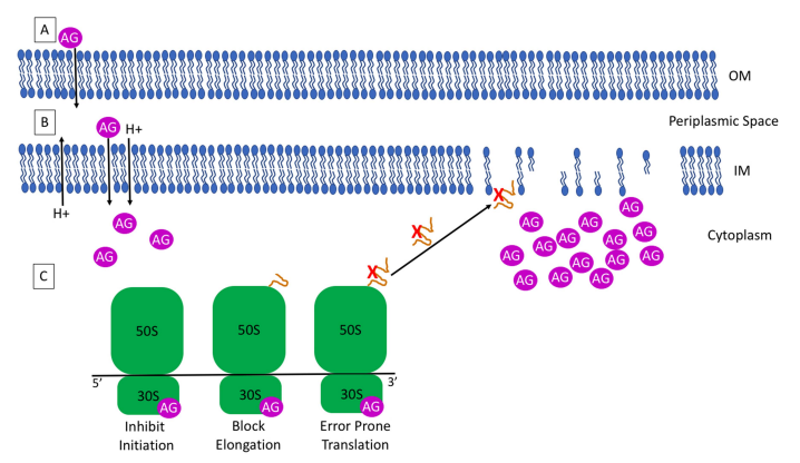 Mecanismo de acción de los aminoglucósidosVersión en línea Reconoce en la imagen los pasos involucrados en el mecanismo de acción de los aminoglucósidos (AG). por Carolina Macero 1 Los AG cargados positivamente ingresan a la célula por la unión a componentes cargados negativamente (fosfolípidos y LPS en Gram- o ácido teicoico en Gram+) 2 El acceso del AG al espacio periplásmico es gracias a la unión electrostática inicial a nivel de la membrana externa 3 Un pequeño número de AG cruza la membrana interna, usando la fuerza motriz del protón, y entra al citoplasma de una manera dependiente de energía 4 En el citoplasma, los AG se unen al ARNr 16S de la subunidad ribosomal 30S donde inhiben el inicio de la traducción 5 En el citoplasma, los AG se unen al ARNr 16S de la subunidad ribosomal 30S donde bloquean la elongación de la traducción 6 En el citoplasma, los AG se unen al ARNr 16S de la subunidad ribosomal 30S donde inducen una traducción propensa a errores 7 Se supone que las proteínas mal traducidas causan daño a la membrana interna, lo que facilita la entrada de AG en el citoplasma. 8 A medida que las moléculas de AG se acumulan, se acelera la inhibición de la síntesis de proteínas y la mala traducción,resultando la rápida destrucción bacteriana, dependiente de la concentración de estos ATM