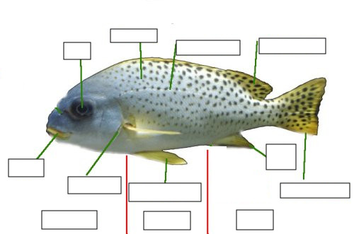 Partes del pezVersión en línea Distinguir cada una de las partes de un pez por Alfonsa Moreno 1 Ojo 2 Tronco 3 Cola 4 Opérculo 5 Boca 6 Escamas 7 Línea lateral 8 Aleta dorsal 9 Aleta caudal 10 Aleta anal 11 Aleta pectoral 12 Cabeza