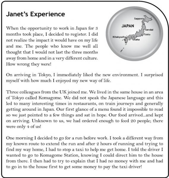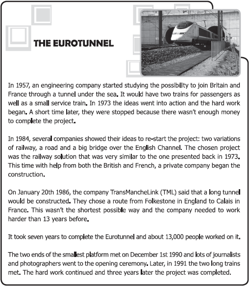 SaberPro Ingles (D)Versión en línea El objetivo de este test es entregar un herramienta al aprendiz para que pueda realizar un entrenamiento previo a la prueba saber pro con el fin de mejorar sus competencias en el idioma ingles. por Viviana Mesa Solano 1 All members of the same team wear this a ball b uniform c field d bike 2 You need this if you want to play tennis. a ball b bike c competition d stadium 3 At the end of this there is usually one winner. a field b player c competition d uniform 4 This is a place outdoors where you can play sports. a prize b field c player d stadium 5 If you travel on it, you will do exercise and save time. a field b bike c ball d competition 6 Be careful! a Yes, I do. b I will. c What a pity! 7 Who's that girl? a Yes, she is. b That´s right. c My sister. 8 What do you think of the teacher? a Great school! b I think so. c I love his class. 9 Do you know Martha? a Who? b Which? c How? 10 Can you pass me the salt? a Here you are. b I like it. c It´s al right 11 Seleccione la palabra según corresponda al texto de la imagen de las preguntas 11 a la 18. a (11) ours b (11) us c (11) our 12 PREGUNTA 12 a (12) while b (12) but c (12) because 13 PREGUNTA 13 a (13) which b (13) who c (13) where 14 PREGUNTA 14 a (14) one b (14) a c (14) the 15 PREGUNTA 15 a (15) large b (15) larger c (15) largest 16 PREGUNTA 16 a (16) such b (16) so c (16) too 17 PREGUNTA 17 a (17) use b (17) using c (17) used 18 PREGUNTA 18 a (18) nobody b (18) anybody c (18) somebody 19 Lea el articulo y luego responda las preguntas de la 19 a la 25. THEY FIRST STARTED TO BUILD THE EUROTUNNEL IN a 1957. b 1973. c 1984. 20 SOME TIME AFTER STARTING THE CONSTRUCTION, THE COMPANY BUILDING EUROTUNNEL a finished the tunnels. b had problems with time. c couldn´t continue. 21 WHAT DID COMPANIES WANT TO DO IN 1984? a build more tunnels b continue building the project c change the project 22 The way in which the company built the tunnel was a a long one. b completed in 13 years. c impossible to build. 23 Compared to what the first company did, TLM´s work was a easier. b shorter. c more difficult. 24 There was a ceremony when the a smallest platform was completed. b travelers´ train met. c project was completed. 25 When was the Eurotunnel project finished? a in 1990 b in 1994 c in 1991 26 RESPONDA LAS PREGUNTAS 26 A 35 DE ACUERDO CON EL SIGUIENTE TEXTO. Lea el artículo y seleccione la palabra adecuada para cada espacio. a (26) brought b (26) caused c (26) built d (26) changed 27 RESPONDA LAS PREGUNTAS 26 A 35 DE ACUERDO CON EL SIGUIENTE TEXTO. Lea el artículo y seleccione la palabra adecuada para cada espacio. a (27) afterwards b (27) ago c (27) already d (27) along 28 RESPONDA LAS PREGUNTAS 26 A 35 DE ACUERDO CON EL SIGUIENTE TEXTO. Lea el artículo y seleccione la palabra adecuada para cada espacio. a (28) found b (28) caught c (28) contained d (28) taken 29 RESPONDA LAS PREGUNTAS 26 A 35 DE ACUERDO CON EL SIGUIENTE TEXTO. Lea el artículo y seleccione la palabra adecuada para cada espacio. a (29) agencies b (29) plans c (29) attractions d (29) reservations 30 RESPONDA LAS PREGUNTAS 26 A 35 DE ACUERDO CON EL SIGUIENTE TEXTO. Lea el artículo y seleccione la palabra adecuada para cada espacio. a (30) his b (30) our c (30) your d (30) their 31 RESPONDA LAS PREGUNTAS 26 A 35 DE ACUERDO CON EL SIGUIENTE TEXTO. Lea el artículo y seleccione la palabra adecuada para cada espacio. a (31) provide b (31) support c (31) afford d (31) compete 32 RESPONDA LAS PREGUNTAS 26 A 35 DE ACUERDO CON EL SIGUIENTE TEXTO. Lea el artículo y seleccione la palabra adecuada para cada espacio. a (32) extreme b (32) good c (32) strict d (32) changing 33 RESPONDA LAS PREGUNTAS 26 A 35 DE ACUERDO CON EL SIGUIENTE TEXTO. Lea el artículo y seleccione la palabra adecuada para cada espacio. a (33) was b (33) are c (33) have d (33) has 34 RESPONDA LAS PREGUNTAS 26 A 35 DE ACUERDO CON EL SIGUIENTE TEXTO. Lea el artículo y seleccione la palabra adecuada para cada espacio. a (34) alive b (34) busy c (34) cool d (34) close 35 RESPONDA LAS PREGUNTAS 26 A 35 DE ACUERDO CON EL SIGUIENTE TEXTO. Lea el artículo y seleccione la palabra adecuada para cada espacio. a (35) quite b (35) much c (35) enough d (35) rather 36 LEA EL TEXTO Y RESPONDA LAS PREGUNTAS. What is the writer trying to do in this article? a encourage tourists to visit Japan b invite colleagues to learn Japanese c describe her job in Japan d share her curious experiences in Japan 37 What can the reader find in this asticle? a facts about Japanese culture b ways to take a taxi in Tokyo c an amusing story about a foreigner d how to order food in restaurants 38 One of the ideas presented in the text is that a It is difficult to share a house with colleagues. b she quickly felt comfortable with the culture. c Japanese taxi drivers can speak English. d she got to work on foot because she likes running. 39 The writer´s family and close friends thought that she a would be treated badly by colleagues. b would enjoy the Japanese culture and way of life c would not be able to make friends. d would miss them and would return before time. 40 The most suitable note for the writer´s employers would be: a I am very grateful for the amazing experience you gave me. I will tell people all about Japanese culture b Thank you very much! I would appreciate living in a more comfortable house next time. c It was a pleasure to work for your company. Next time, I suggest providing a map for foreign employees. d I am really happy because it is time to leave Japan. I hope you are satisfied with my work.
