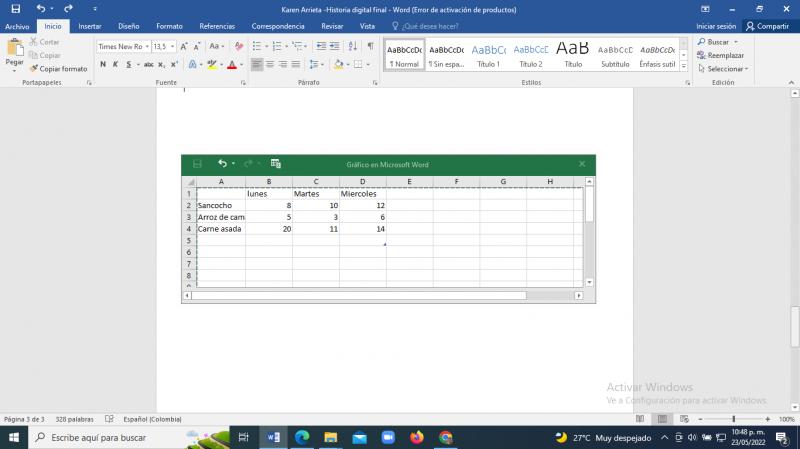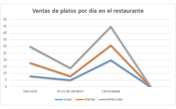 Tabla de datosVersión en línea Analiza la información en la tabla de datos y gráfica estadística, para luego responder las preguntas. por karen arrieta 1 Don pedro lleva en una tabla de datos la información de los platos más vendidos en el restaurante los días lunes, martes y miércoles. Descritos en la siguiente tabla de Excel. Teniendo presente la información en la tabla de datos. ¿Cuántos platos de comida vendió Don pedro en los tres días? a 90 b 89 c 100 d 85 2 Con la información de la tabla de datos, Don pedro pudo hacer la siguiente gráfica, para mostrar el plato más vendido en los días lunes, martes y miércoles. Según la gráfica estadística, ¿Cuál es el plato con mayor venta en el restaurante? a Arroz de camarón b Pechuga c Carne asada d Sancocho