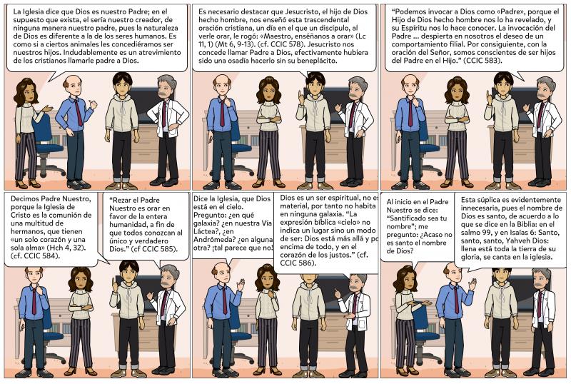 La oración empieza con la invocación: Padre Nuestro que estas en el cielo. “La expresión bíblica «cielo» no indica un lugar sino un modo de ser: Dios está más allá y por encima de todo; la expresión designa la majestad, la santidad de Dios, y también su presencia en el corazón de los justos. El cielo, o la Casa del Padre, constituye la verdadera patria hacia la que tendemos en la esperanza, mientras nos encontramos aún en la tierra. Vivimos ya en esta patria, donde nuestra «vida está oculta con Cristo en Dios» (Col 3, 3).” (CCIC 586). Dios está fuera del espacio y del tiempo, esto es difícil de concebir, pues nuestra existencia terrenal se desarrolla en esta categoría espacio temporal.