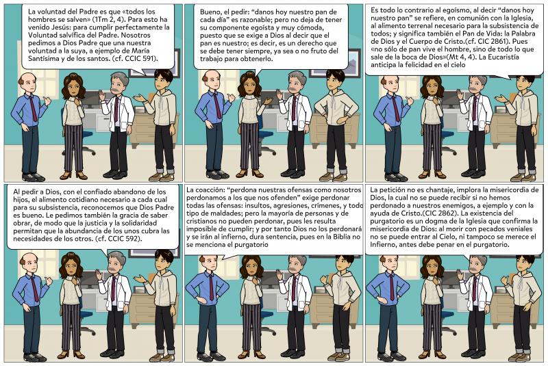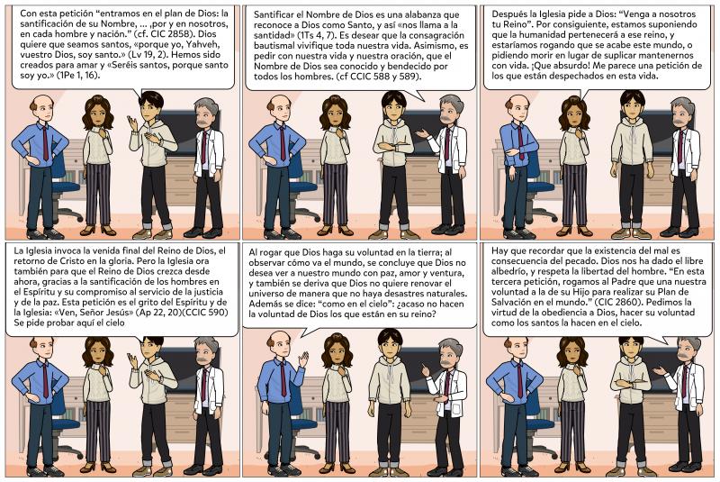 En el Padre Nuestro, las tres primeras peticiones tienen por objeto la Gloria del Padre: la santificación del nombre, la venida del reino y el cumplimiento de la voluntad divina. Las otras cuatro presentan al Padre nuestros deseos: estas peticiones conciernen a nuestra vida para alimentarla o para curarla del pecado y se refieren a nuestro combate por la victoria del Bien sobre el Mal. (CIC 2857).