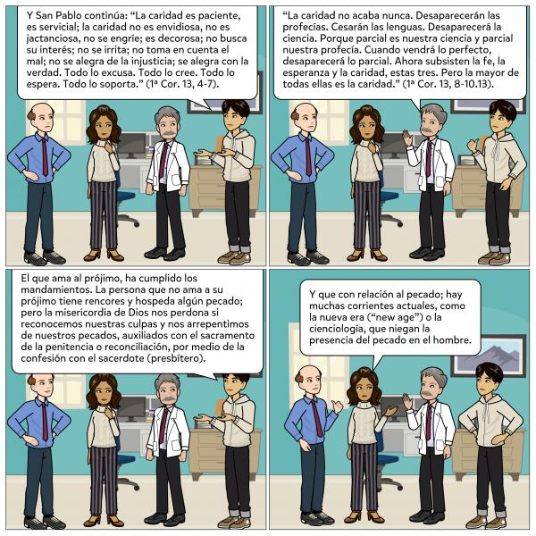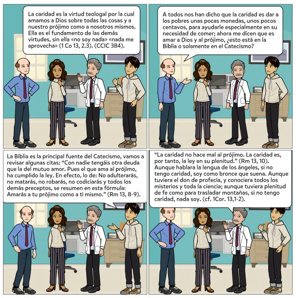 Las virtudes teologales son la fe, la esperanza y la caridad. La fe es la virtud teologal por la que creemos en Dios y en todo lo que Él nos ha revelado, y que la Iglesia nos propone creer, dado que Dios es la Verdad misma. La esperanza es la virtud teologal por la que deseamos y esperamos de Dios la vida eterna como nuestra felicidad, confiando en las promesas de Cristo, y apoyándonos en la ayuda de la gracia del Espíritu Santo para merecerla y perseverar hasta el fin de nuestra vida terrena. La caridad es la virtud teologal por la cual amamos a Dios sobre todas las cosas y a nuestro prójimo como a nosotros mismos por amor a Dios. Jesús hace de ella el mandamiento nuevo, la plenitud de la Ley. Ella es «el vínculo de la perfección» (Col 3, 14) y el  fundamento de las demás virtudes, a las que anima, inspira y ordena: sin ella «no soy nada» y «nada me aprovecha» (1 Co 13, 2-3). (CCIC 385-388).