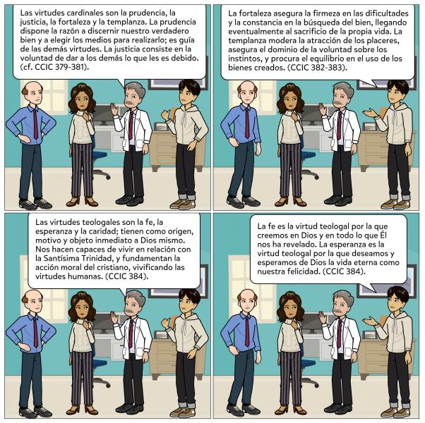 La prudencia dispone la razón a discernir, en cada circunstancia, nuestro verdadero bien y a elegir los medios adecuados para realizarlo; es guía de las demás virtudes, indicándoles su regla y medida. La justicia consiste en la constante y firme voluntad de dar a los demás lo que les es debido. La fortaleza asegura la firmeza en las dificultades y la constancia en la búsqueda del bien, llegando incluso a aceptar el eventual sacrificio de la propia vida por una causa justa. La templanza modera la atracción de los placeres, asegura el dominio de la voluntad sobre los instintos y procura el equilibrio en el uso de los bienes creados. (CCIC 379-383).