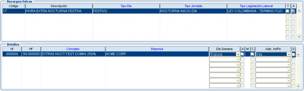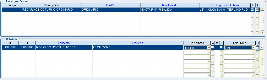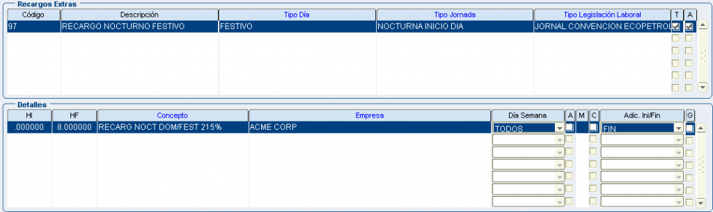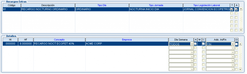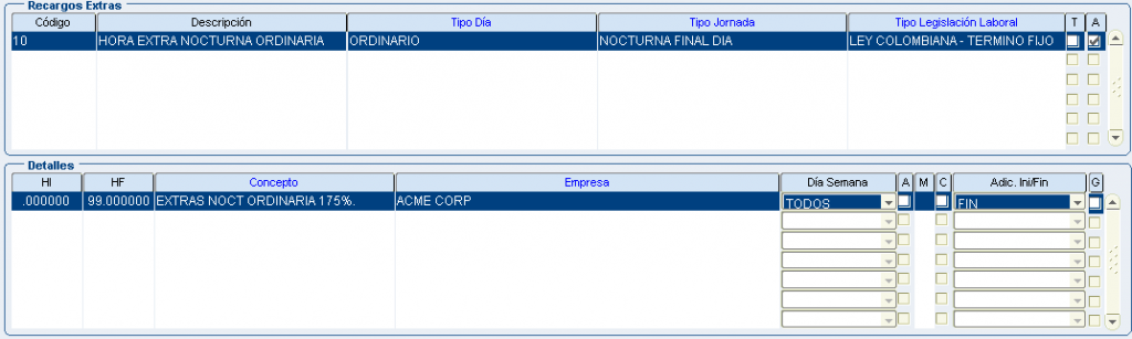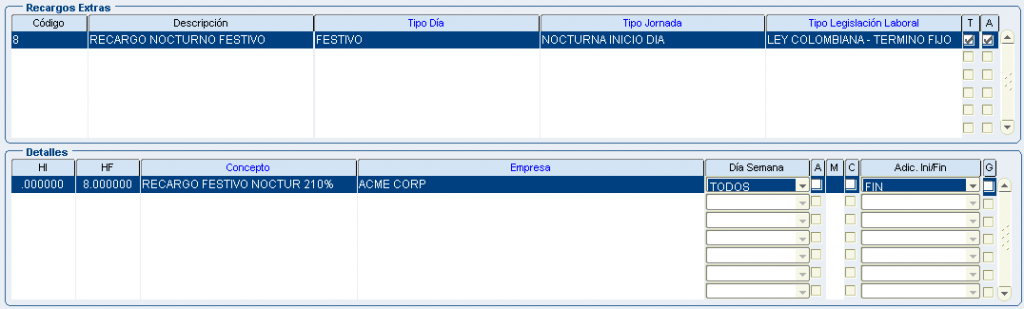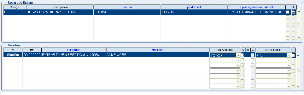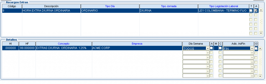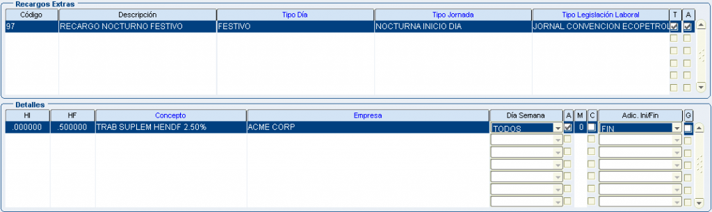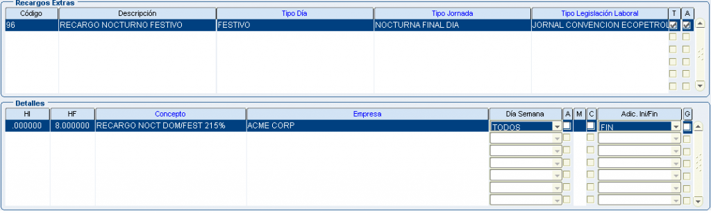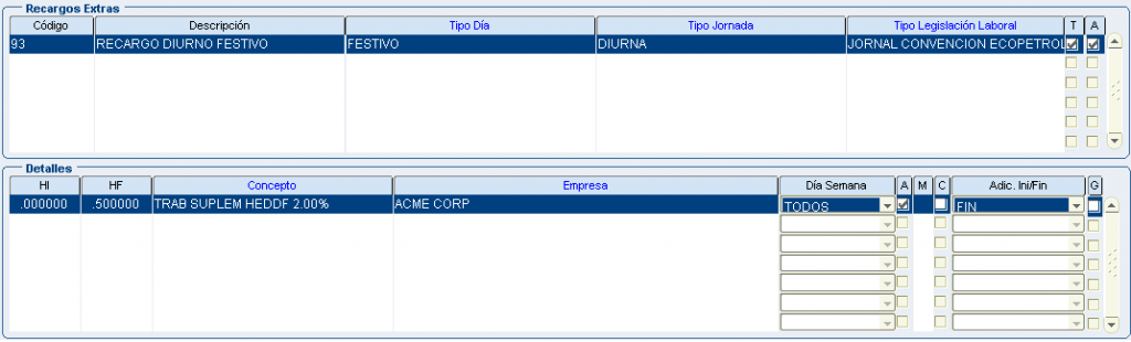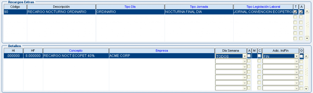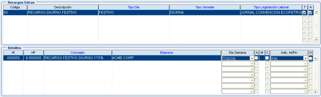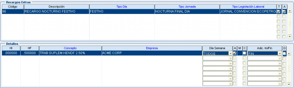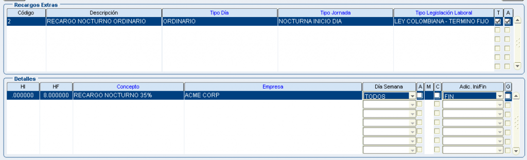 Froggy Jumps Programación turnos: configuración conceptos recargos y horas extrasVersión en línea Configuración para la programación de turnos - recargos y horas extras. Tenga en la mente la pantalla: configuración recargos hx. por john segovia 1 tipo dia: ordinario/tipo jornada: nocturno inicio dia/dentro del turno/Ley colombiana término fijo/ a 8 primeras horas:Recargo nocturno ordinario 35%(hora inicial 00:00 hora final 08:00) b 8 primeras horas:Recargo nocturno festivo 110%(hora inicial 00:00 hora final 08:00) con compensator c 8 primeras horas:Recargo nocturno ordinario 40% (hora inicial 00:00 hora final 08:00) 2 tipo dia: ordinario/tipo jornada: nocturno final dia/dentro del turno/Ley colombiana término fijo/ a 8 primeras horas:Recargo nocturno ordinario 35%(hora inicial 00:00 hora final 08:00) b 8 primeras horas:Recargo nocturno festivo 110%(hora inicial 00:00 hora final 08:00) con compensator c 8 primeras horas:Recargo nocturno ordinario 40% (hora inicial 00:00 hora final 08:00) 3 tipo dia: festivo/tipo jornada: nocturno inicio dia/dentro del turno/Ley colombiana término fijo/ a 8 primeras horas:Recargo nocturno ordinario 35%(hora inicial 00:00 hora final 08:00) b 8 primeras horas:Recargo nocturno festivo 110%(hora inicial 00:00 hora final 08:00) con compensator c 8 primeras horas:Recargo nocturno ordinario 40% (hora inicial 00:00 hora final 08:00) 4 tipo dia: festivo/tipo jornada: nocturno final dia/dentro del turno/Ley colombiana término fijo/ a 8 primeras horas:Recargo nocturno ordinario 35%(hora inicial 00:00 hora final 08:00) b 8 primeras horas:Recargo nocturno festivo 110%(hora inicial 00:00 hora final 08:00) con compensator c 8 primeras horas:recargo festivo diurno 75% (hora inicial 00:00 hora final 08:00) con compensatorio 5 tipo dia: festivo/tipo jornada: diurno/dentro del turno/Ley colombiana término fijo/ a 8 primeras horas:Recargo nocturno ordinario 35%(hora inicial 00:00 hora final 08:00) b 8 primeras horas:Recargo nocturno festivo 110%(hora inicial 00:00 hora final 08:00) con compensator c 8 primeras horas:recargo festivo diurno 75% (hora inicial 00:00 hora final 08:00) con compensatorio 6 tipo dia: ordinario/tipo jornada: nocturno inicio dia/dentro del turno/Jornal Conv Ecopetrol/ a 8 primeras horas:Recargo nocturno ordinario 35%(hora inicial 00:00 hora final 08:00) b 8 primeras horas:Recargo nocturno festivo 110%(hora inicial 00:00 hora final 08:00) con compensator c 8 primeras horas:Recargo nocturno ordinario 40% (hora inicial 00:00 hora final 08:00) 7 tipo dia: ordinario/tipo jornada: nocturno final dia/dentro del turno/Jornal Conv Ecopetrol/ a 8 primeras horas:Recargo nocturno ordinario 35%(hora inicial 00:00 hora final 08:00) b 8 primeras horas:Recargo nocturno festivo 110%(hora inicial 00:00 hora final 08:00) con compensator c 8 primeras horas:Recargo nocturno ordinario 40% (hora inicial 00:00 hora final 08:00) 8 tipo dia: festivo/tipo jornada: nocturno inicio dia/dentro del turno/Jornal Conv Ecopetrol/ a 8 primeras horas:Recargo nocturno ordinario 35%(hora inicio 00:00 hora fin 08:00) b 8 primeras horas:Recargo nocturno festivo 110%(hora inicial 00:00 hora final 08:00) con compensator c 8 primeras horas:Recargo noct dom/fest 115%(hora inicio 00:00 hora fin 08:00) con compensatorio 9 tipo dia: festivo/tipo jornada: nocturno final dia/dentro del turno/Jornal Conv Ecopetrol/ a 8 primeras horas:Recargo nocturno ordinario 35%(hora inicio 00:00 hora fin 08:00) b 8 primeras horas:Recargo nocturno festivo 110%(hora inicial 00:00 hora final 08:00) con compensator c 8 primeras horas:Recargo noct dom/fest 115%(hora inicio 00:00 hora fin 08:00) con compensatorio 10 tipo dia: festivo/tipo jornada: diurno/dentro del turno/Jornal Conv Ecopetrol/ a 8 primeras horas:Recargo nocturno ordinario 35%(hora inicio 00:00 hora fin 08:00) b 8 primeras horas:Recargo nocturno festivo 110%(hora inicial 00:00 hora final 08:00) con compensator c 8 primeras horas:Recargo festivo diurno 75%(hora inicio 00:00 hora fin 08:00) con compensatorio 11 tipo dia: festivo/tipo jornada: diurno/dentro del turno/Jornal Conv Ecopetrol/ADIC.SOBRETIEMPO 30min a primera 1/2 hora:TRAB SUPLEM HEDDF 2.00(hora inicio 00:00 hora fin 00:50) Y ADICIONAL AL TURNO b primera 1/2 hora:EXTRAS DIURN FEST DOMIN 200%(hora inicial 00:00 hora final 99:00) c primera 1/2 hora:EXTRAS DIURNA ORDINARIA 125%(hora inicio 00:00 hora fin 99:00) 12 tipo dia: ordinario/tipo jornada: diurno/dentro del turno/Jornal Conv Ecopetrol/ADIC.SOBRETIEM 30min a primera 1/2 hora:TRAB SUPLEM HED 1.25(hora inicio 00:00 hora fin 00:50) Y ADICIONAL AL TURNO b primera 1/2 hora EXTRAS DIURN FEST DOMIN 200%(hora inicial 00:00 hora final 99:00) c primera 1/2 hora:EXTRAS DIURNA ORDINARIA 125%(hora inicio 00:00 hora fin 99:00) 13 tipo dia: festivo/tipo jornada: noct fin dia/dentro del turno/Jornal Conv Ecopetrol/ADIC.SOBRE 30min a primera 1/2 hora:TRAB SUPLEM HEDDF 2.50(hora inicio 00:00 hora fin 00:50) Y ADICIONAL AL TURNO b primera 1/2 hora:EXTRAS NOCT FEST DOMIN 250%(hora inicial 00:00 hora final 99:00) c primera 1/2 hora:EXTRAS NOCT ORDINARIA 175%.(hora inicio 00:00 hora fin 99:00) 14 tipo dia: festivo/tipo jornada: noct fin dia/fuera del turno/Ley Colombia Termino Fijo a TRAB SUPLEM HEDDF 2.50(hora inicio 00:00 hora fin 00:50) Y ADICIONAL AL TURNO b EXTRAS NOCT FEST DOMIN 250%(hora inicial 00:00 hora final 99:00) c EXTRAS NOCT ORDINARIA 175%.(hora inicio 00:00 hora fin 99:00) 15 tipo dia: festivo/tipo jornada: noct ini dia/fuera del turno/Ley Colombia Termino Fijo a TRAB SUPLEM HEDDF 2.50(hora inicio 00:00 hora fin 00:50) Y ADICIONAL AL TURNO b EXTRAS NOCT FEST DOMIN 250%(hora inicial 00:00 hora final 99:00) c EXTRAS NOCT ORDINARIA 175%.(hora inicio 00:00 hora fin 99:00) 16 tipo dia: festivo/tipo jornada: diurno/fuera del turno/Ley Colombia Termino Fijo a TRAB SUPLEM HED 1.25(hora inicio 00:00 hora fin 00:50) Y ADICIONAL AL TURNO b EXTRAS DIURN FEST DOMIN 200%(hora inicial 00:00 hora final 99:00) c EXTRAS DIURNA ORDINARIA 125%(hora inicio 