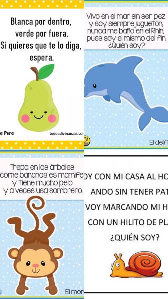 Adivina AdivinadorVersión en línea Mediante las adivinanzas infantiles se busca ejercitar la mente y desarrolar habilidades de escucha, lógica y deducción. (En esta actividad vamos a necesitar la ayuda de un adulto quien le lea a los niños las preguntas para que ellos puedan pensar y responder) Alumna: Odriozola Miranda Lisa Magali. Materia: TADI Alfabetización Inicial. Curso: 1°B Educación Inicial Año: 2022 por Lisa Magali Odriozola Miranda 1 Blanca por dentro, verde por fuera. Si quieres que te lo diga espera. Pistas 1 Vivo en el mar sin ser pez y soy siempre juguetón, nunca me baño en el Rhin porque soy el mismo del fin. ¿Quién soy? 2 Trepa en los árboles y come bananas. Es mamifero y tiene mucho pelo y hasta aveces usa sombrero.. ¿Quién es? 3 Llevo mi casa al hombro, camino sin una pata y voy dejando mi huella con un hilito de plata. ¿Quién soy?