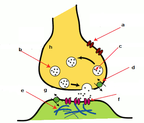 sinapsis química (D)Versión en línea La sinápsis es la comunicación entre dos neuronas para transmitir la información, están presentes los siguientes elementos: hendidura sináptica, vesicula con neurotransmisores, botón presináptico, botón postsináptico, neurotransmisores, bombas de captación, receptor de neurotransmisores. Vamos a ubicarlos en la siguiente imagen!! por Liliana Vega Toro 1 canales ionicos 2 vesicula con neurotransmisores 3 neurotransmisores 4 bomba de captación 5 boton postsinaptico 6 receptores 7 hendidura sinaptica 8 boton presinaptico 9 neurotransmisores recapturados