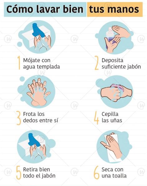 lavado de manos Versión en línea Identifica los pasos para lavarte correctamente las manos. por FERNANDO JOSUE CARRILLO MARTINEZ 1 Paso 1: Mojar las manos con agua templada. 2 Paso 2: Pon suficiente jabón en tus manos 3 Paso 3: Frota tus manos y no olvides entre tus dedos 4 Paso 4: Cepilla las uñas. 5 Paso 5: Enjuaga tus manos, retira bien todo el jabón 6 Paso 6: Seca tus manos con una toalla limpia