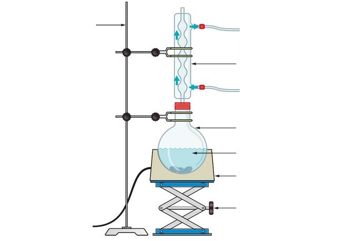 Montage à refluxVersión en línea Associer la légende au schéma du montage à reflux por Lea Rieusse 1 Sortie d'eau 2 Entrée d'eau 3 Réfigérant à boules 4 Chauffe-ballon 5 Ballon à fond rond 6 Support élévateur 7 potence 8 Mélange réactionnel