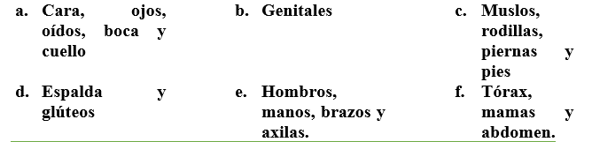 Ordena las distintas partes del cuerpo en el orden correcto de higiene completa en cama: