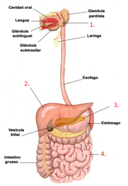 Completa la imagen del aparato digestivo con el nombre de las partes que se indican a continuación: (Faringe; Intestino delgado; Hígado; Páncreas)