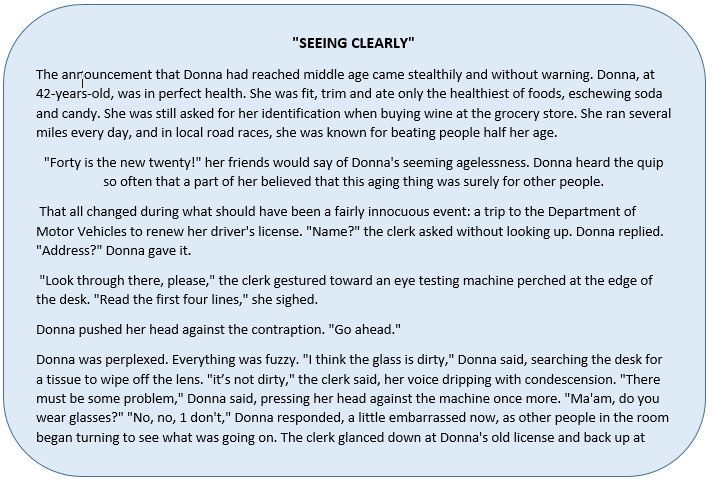 SIMULACRO FINAL EXAM - ENGLISH III - PART VIVersión en línea Con base al texto responda las siguientes preguntas por Diana Patricia Mendoza Guantiva 1 What proverb best fits this story? a Time marches on. b Time heals all wounds. c A stitch in time saves nine d There is no time like che present. 2 Which is che best antonym far stealthily? a Honestly b Obviously c Slowly d Sneakily 3 lf Donna is eschewing candy and soda, what is she doing? a Overindulging b Avoiding them c Eating them in moderation d Eating only the all-natural versions 4 Using the passage which best describes the meaning of “Forty is the new Twenty”? a When people turn 40, they are likely to say they are in their 20s. b If you are 20 and are not in great shape, you can feel like you are 40. c If you stay away from junk food, you can look 40 even when you are 20. d If you are in good shape and health, being 40 can feel like 20. 5 As used in the middle of the passage, which is the best antonym for innocuous? a dangerous b difficult c juvenile d mature