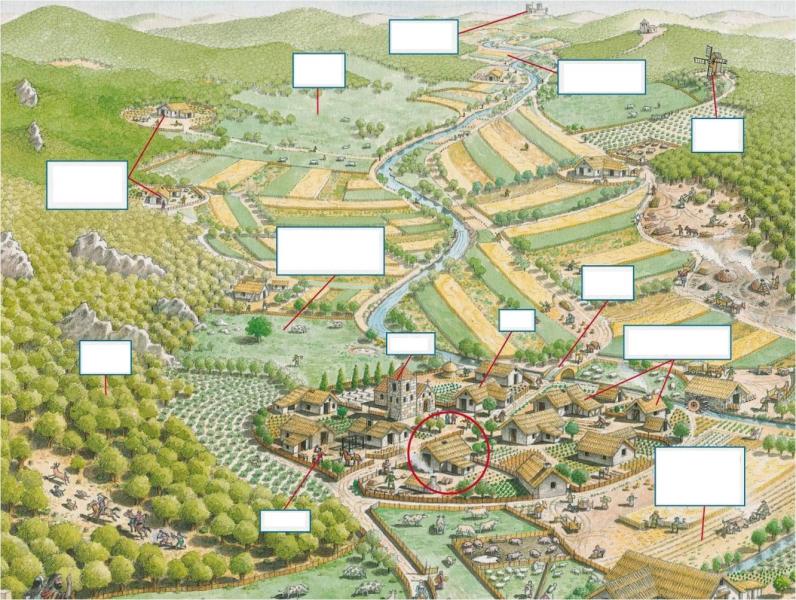 Partes de un feudo (D)Versión en línea Con este mapa interactivo aprenderás a distinguir las parte de un feudo. Lee el concepto y clickea sobre la imagen por Román Peláez Forné 1 Prados del señor 2 Castillo 3 Propiedades de campesinos libres 4 Bosques del señor 5 Herrero 6 Iglesia 7 Manso o tierras trabajadas por campesinos 8 Reserva o tierras del señor 9 Molino del señor 10 Puente del señor 11 Aldea 12 Casas de campesinos libres y siervos 13 Manso o tierras trabajadas por campesinos