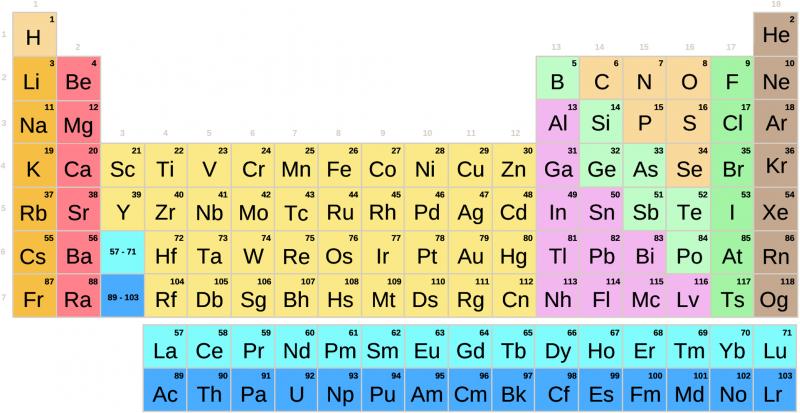 Tabla periódica completaVersión en línea Tabla periódica familias A y B por Nancy Cruz 1 Hidrógeno 2 Litio 3 Sodio 4 Potasio 5 Rubidio 6 Cesio 7 Francio 8 Berilio 9 Magnesio 10 Calcio 11 Estroncio 12 Bario 13 Radio 14 Escandio 15 Itrio 16 Lantano 17 Actinio 18 Titanio 19 Zirconio 20 Hafnio 21 Rutherfordio 22 Vanadio 23 Niobio 24 Tantalio 25 Dubnio 26 Cromo 27 Molibdeno 28 Volfamio 29 Seaborgio 30 Manganeso 31 Tecnecio 32 Renio 33 Bohrio 34 Hierro 35 Rutenio 36 Osmio 37 Hassio 38 Cobalto 39 Rodio 40 Iridio 41 Meitnerio 42 Niquel 43 Paladio 44 Platino 45 Darmstadtio 46 Cobre 47 Plata 48 Oro 49 Roentgenio 50 Zinc 51 Cadmio 52 Mercurio 53 Copernico 54 Boro 55 Aluminio 56 Galio 57 Indio 58 Talio 59 Nihonium 60 Carbono 61 Silicio 62 Germanio 63 Estaño 64 Plomo 65 Flerovio 66 Nitrógeno 67 Fósforo 68 Arsénico 69 Antimonio 70 Bismuto 71 Moscovium 72 Oxígeno 73 Azufre 74 Selenio 75 Telurio 76 Polonio 77 Livermorio 78 Flúor 79 Cloro 80 Bromo 81 Yodo 82 Astato 83 Tennessine 84 Helio 85 Neón 86 Argón 87 Kriptón 88 Xenón 89 Radón 90 Oganesson