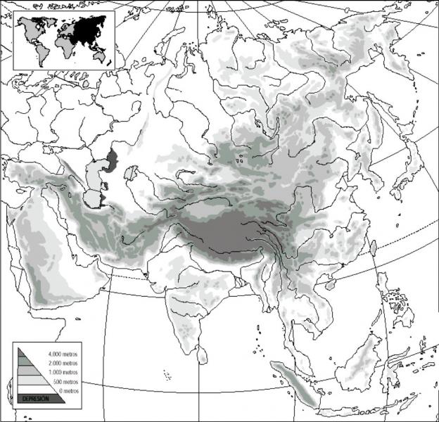 MAPA ASIA FÍSICOVersión en línea Localiza los accidentes geográficos más importantes del continente asiático. por Casimiro Valle 1 Lago Baikal 2 Lago/Mar de Aral 3 Lago/Mar Caspio 4 Río Obi 5 Río Yenesei 6 Río Lena 7 Río Huang He 8 Río Yangsté 9 Río Mekong 10 Río Ganges 11 Río Indo 12 Mar de Japón 13 Mar de China 14 Mar Arábigo 15 Islas de Japón 16 Isla de Taiwán 17 Islas Filipinas 18 Islas de Indonesia 19 Isla de Sri lanka 20 Llanura de Siberia 21 Cordillera de los Urales 22 Montes Zagros 23 Cordillera del Himalaya 24 Pico Everest 25 Golfo de Bengala 26 Golfo de Tailandia 27 Península de Arabia 28 Península de la India 29 Península de Indochina 30 Península de Corea