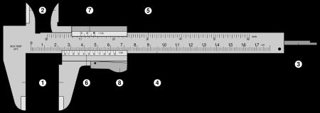 Partes del CalibreVersión en línea Localiza las distintas partes de un Calibre o Pie de Rey. por Gustavo Cuesta 1 Mordazas para medidas exteriores 2 Mordazas para medidas interiores 3 Coliza para medidas de profundidades 4 Regla en centímetros 5 Regla en pulgadas 6 Nonio para fracciones de milímetro 7 Nonio para fracciones de pulgada 8 Botón de deslizamiento y freno