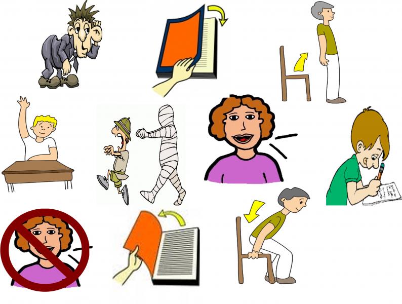 German Classroom InstructionsVersión en línea Match the verbal German Classroom instruction with the appropriate picture por Mrs. Whitney 1 Schreibht 2 Mach das Buch auf 3 Mach das Buch zu 4 Steht auf 5 Setzt euch 6 Hebt die Hand 7 Wiederholt 8 Sprecht 9 Hört zu 10 Sprecht nicht