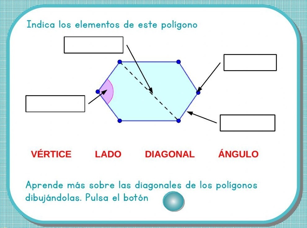 Diagonales de un polígono.Versión en línea Selecciona los puntos que corresponda a cada elemento del polígono. por Estefany Mella 1 Angulo 2 Diagonal 3 Lado 4 Vértice