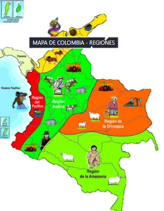 Relieve de las regiones de ColombiaVersión en línea Principales relieves de las regiones de Colombia por Sergio Andres Guerrero Cardenas 1 Relieve región Caribe 2 Relieve región Andina 3 Relieve región Pacífica 4 Relieve región Amazónica 5 Relieve región Orinoquía 6 Relieve región Insular Explicación 1 Se destaca la Sierra Nevada de Santa Martha 2 Cordillera Oriental: las serranías de Perijá, y los Motilones. Cordillera Central: la serranía de San Lucas. Cordillera Occidental: las serranías de Abibe, San Jeronimo y Ayapel. 3 Relieve casi plano formado por grandes llanuras de inundación, lagos y pantanos alineados paralelamente a la costa. 4 El relieve del Amazonas es principalmente llano, cubierto de una extensa y densa selva tropical, cruzado por numerosos y caudalosos ríos. 5 Se encuentran algunas elevaciones como la Serranía de la Macarena, la Cordillera Oriental y la Sierra de la Lindosa. 6 comprende el conjunto de las islas, cayos e islotes continentales alejados de las costas, como son el Archipiélago de San Andrés y Providencia en el mar Caribe y las islas Malpelo y Gorgona en el océano Pacífico.