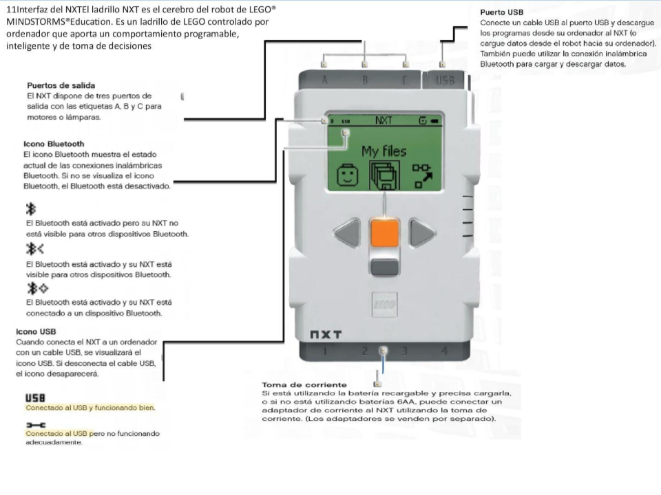 Partes del Ladrillo Lego NXTVersión en línea Identificar las partes básicas del ladrillo NXT y sus funciones por Maria de Jesús González de Anda 1 Encender 2 Apagar 3 Menú izquierda 4 Menú derecha 5 Display / Pantalla 6 Puertos para Servomotores 7 Puertos para sensores Explicación 1 Al presionar este botón, se enciende el ladrillo. También sirve como Enter / Aceptar. 😀 2 Al presionar 4 segundos, se apagará el ladrillo.😴 3 Desplaza el menú hacia la izquierda. ⬅️ 4 Desplaza el menú a la derecha➡️ 7 Con los cables, conecta cada sensor en su puerto correspondiente. 🤓