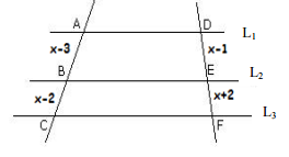 Teorema de ThalesVersión en línea ejercicios simples sobre este gran teorema. por Barbara Alvarez Mancilla 1 En la figura, para que L1//L2//L3, el valor de X debe ser: a -2 b 2 c 3 d 4 2 En la figura L1//L2//L3, si AB= 6 cm; AC=10cm y EF= 5cm, entonces de= ? a 3,3 cm b 6,6 cm c 7cm d 7,5 cm 3 En la figura BC// DE, entonces x=? a 1 b 2/3 c 3/2 d 2 4 En la figura muestra un rectángulo ABEF con, BC= 10, CF=4 y CD=4 ¿cúanto mide el perímetro del trapecio ABCD? a 22 b 28 c 32 d 36 5 3 árboles se encuentran alineados como muestra la figura, el más pequeño mide 2 metros y el mediano 3 metros, si la distancia entre cada par de arboles es de 3 metro.¿cuánto mide el árbol más alto? a 3,5 b 4 c 4,5 d 5