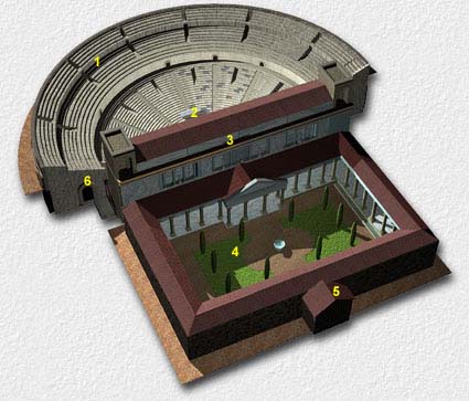 Partes del teatro romanoVersión en línea Identificar cada uno de los elementos de los edificios teatrales por Lesly Alcocer 1 Cavea 2 orchestra 3 cuadriporticus 4 Porticus 5 scaena 6 Porticus post scaenam