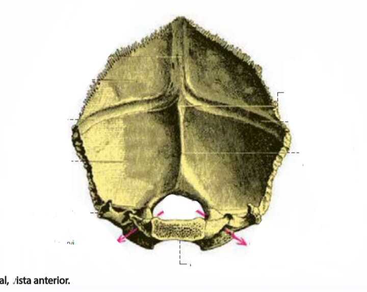 Hueso occipital de una vista anteriorVersión en línea Accidentes anatómicos del hueso occipital de una vista anterior por Medicoblasto G.V. 1 Surco del seno sagital superior 2 Fosa cerebral 3 Protuberancia occipital interna 4 Surco del seno transverso 5 Fosa cerebelosa 6 Foramen magno 7 Porción bacilar 8 Conducto del nervio hipogloso 9 Apófisis yugular 10 Cresta occipital interna