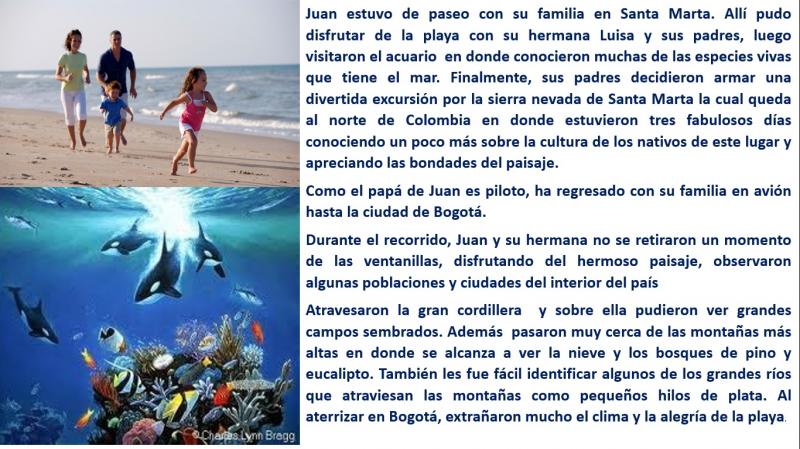 Sociales 2° examen 2Versión en línea Lee, observa y responde analizando bien cada pregunta. por Alba Rocio David Hernández 1 Un elemento natural que nos ayuda a orientarnos en cualquier lugar es: a El sol b El mar c Las montañas d Las plantas 2 El nevado se diferencia de la montaña porque tiene en su cima: a Un cráter o boca. b Un terreno plano. c Una gran laguna. d Una capa de nieve 3 El texto afirma que, al llegar a Bogotá, la familia de Juan extrañó el clima y la alegría de la playa. Esto quiere decir que en Bogotá el clima es: a Templado b Cálido c Páramo d Frío 4 según la imagen. Carlos esta señalando con su mano derecha: a El occidente b El oriente c El norte d El sur 5 Según la ubicación de Carlos a su espalda se encuentra: a El oriente b El Occidente c El sur d El norte 6 Según el texto. La Sierra Nevada de Santa Marta está ubicada al a Oriente de nuestro país. b Occidente de Colombia. c Norte de Colombia d Sur del país.