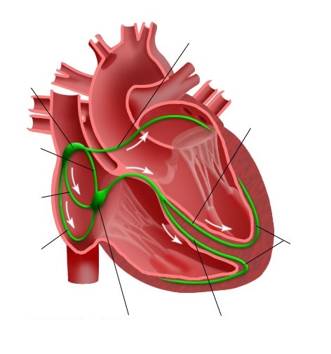 Sistema de conducción eléctrica del corazónVersión en línea En la imagen deberás pulsar el botón que señale la parte del sistema de conducción eléctrica que corresponda a la descripción que aparece en la parte superior de la pantalla. por Feldin Yanez 1 Nodo sinoauricular 2 Nodo auriculoventricular 3 Fibras de Purkinje 4 Haz de His-Purkinje 5 Vías internodales 6 Haz interauricular de Bachmann Explicación 1 Son miocitos modificados 2 Se convierte en marcapaso cuando falla el nodo SA, conducción lenta por baja densidad de uniones GAP 3 Especializadas en conducción rápida por una alta densidad de uniones GAP. 4 Despolarizan el tabique interventricular