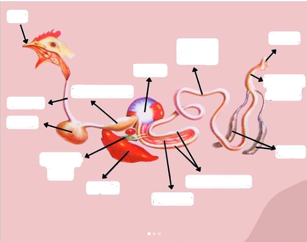 Sistema digestivo de la gallinaVersión en línea Identificar las partes que conforman el sistema digestivo de la gallina. por Jesus Marin 1 esófago 2 Pico 3 Buche 4 Proventrículo 5 Molleja 6 Intestino delgado 7 Asa duodenal 8 Páncreas 9 Hígado 10 Vesícula biliar 11 Ciegos 12 Intestino grueso 13 Cloaca Explicación 5 Como la gallina no tiene dientes, la molleja cumple esta función, utilizando pequeños fragmentos de piedras que la gallina ingiere para ayudar a moler los alimentos en partículas más pequeñas.