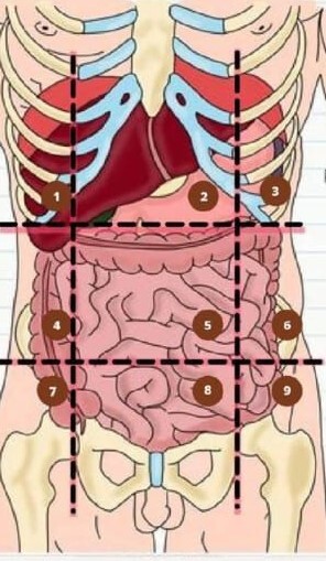 Cuadrantes abdominalesVersión en línea Deberas de localizar los Cuadrantes abdominales para completar la actividad. por López García Jonathan 1 HIPOCORDRIO DERECHO 2 EPIGASTRIO 3 HIPOCONDRIO IZQUIERDO 4 FLANCO DERECHO 5 MESOGASTRICO 6 FLANCO IZQUIERDO 7 FOSA ILIACA DERECHO 8 HIPOGASTRICO 9 FOSA ILIACA IZQUIERDA