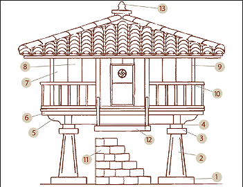 el horréoVersión en línea Aprende las partes del horréo tradicional Asturiano con este juego interactivo. por Blas de Lafuente Gómez 1 subidera 2 pegollo 3 trabe 4 ontera 5 tenobia 6 muela
