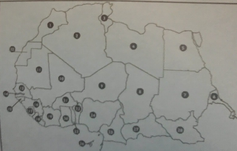 Northern Africa Map QuizVersión en línea A map quiz of northern Africa. por MJ Albenberg 1 Morocco 2 Algeria 3 Tunisia 4 Libya 5 Egypt 6 Eritrea 7 Sudan 8 Chad 9 Niger 10 Mali 11 Mauritania 12 Western Sahara 13 Senegal 14 Gambia 15 Guinea-Bissau 16 Guinea 17 Sierra Leone 18 Liberia 19 Ivory Coast 20 Ghana 21 Burkina Faso 22 Togo 23 Benin 24 Nigeria 25 Cameroon 26 Sao Tome & Principe 27 Central Africa Republic 28 South Sudan