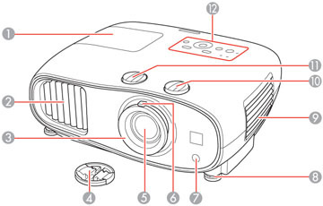 Partes de un proyectorVersión en línea Localiza las partes de un proyector por Paula Llinares 1 Tapa de la lámpara 2 Salida de aire 3 Anillo de enfoque 4 Tapa de la unidad de la lente 5 Lente 6 Anillo de zoom 7 Receptor del control remoto 8 Pata ajustable delantera 9 Tapa del filtro de aire y toma de aire 10 Dial de desplazamiento vertical de la lente 11 Dial de desplazamiento horizontal de la lente 12 Panel de control
