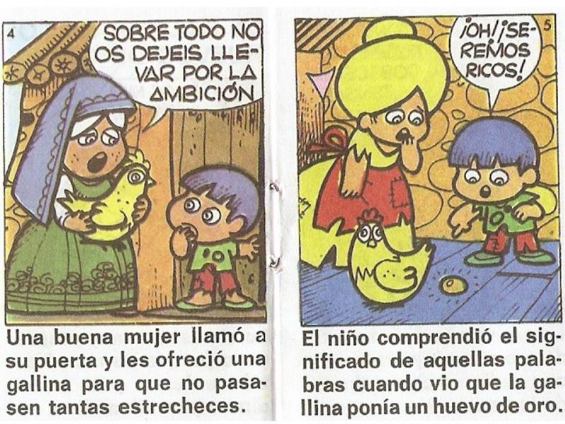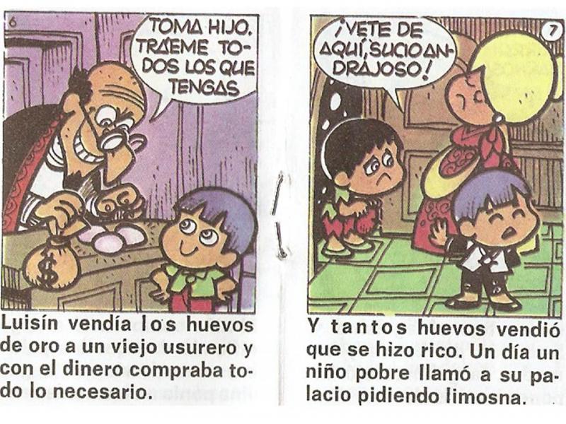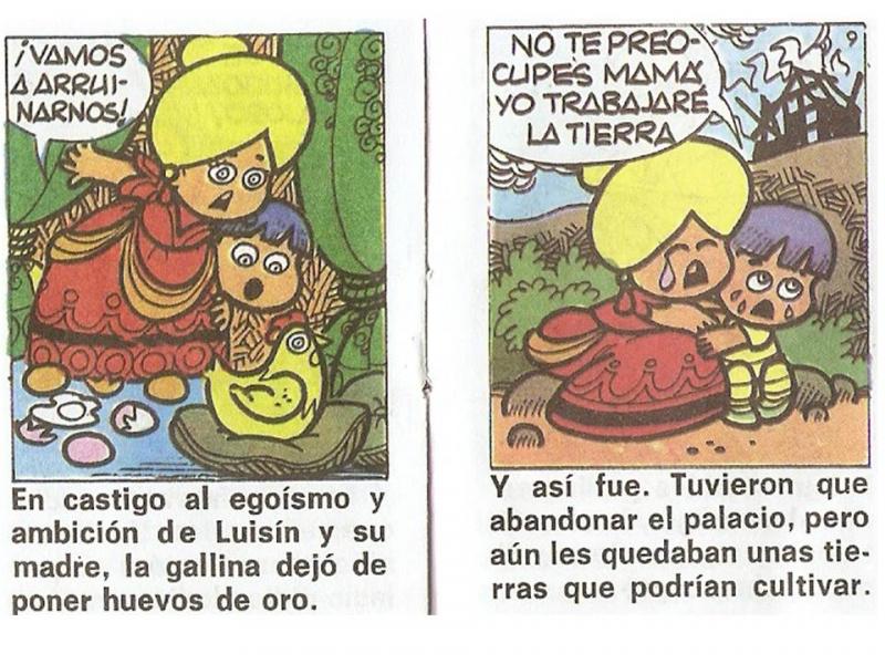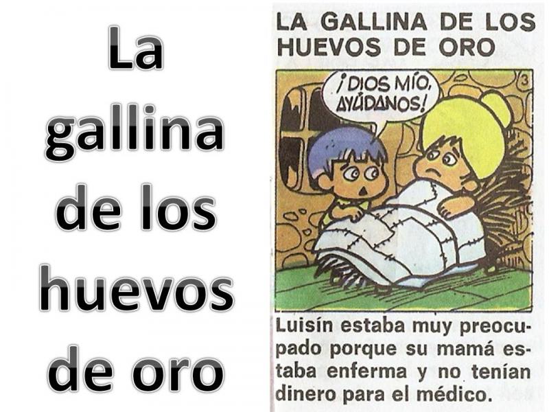 KALEN La gallina de huevos de oroVersión en línea es un cuento que nos deja una enseñanza de convivencia por fer y eluney 1 Cómo se llama el niño de la historia? a Pepito b Luisin c Camilo d Ramón 2 Quién estaba enferma en la historia? a El perro de Luisin b Nadie estaba enfermo c La tía d La mamá de Luisin 3 Por qué la mamá de Luisin no podía ir al médico? a Estaba muy ocupada b Le daba pereza c No tenían dinero d Tenían una fiesta 4 Qué le ofreció a Luisin la señora que toco a su puerta? a Una alcancía b Una casa c Un trabajo d Una gallina 5 Por qué Luisin pensó que la gallina lo haría rico? a Porque era muy bonita b Porque pone huevos de oro c Porque salta muy alto d Porque come poco 6 Qué hacía Luisin con los huevos de oro de su gallina? a Los regalaba a los pobres b Jugaba con ellos c Sacaba pollitos d Los vendía y conseguía mucho dinero 7 Qué paso con el niño pobre que toco la puerta de luisin? a Le dio comida b Lo hecho de su palacio c Lo dejo dormir un rato d Le regalo ropa 8 Cuál fue el castigo para Luisin y su mamá? a La gallina no puso más huevos de oro b Limpiar el piso de todas las casas c Se derrumbó su casa d Le pegaron sus papás 9 Qué hizo Luisin con el mendigo que había ofendido? a Salieron a comer helado b Le pidió perdón y trabajaron juntos c Le pego de nuevo d Lo invito a comer 10 Qué aprendió Luisin al final? a Hay que tratar mal a los que tienen pocas cosas b No hay que ofender a los demás y hay que trabajar para lograr lo que queremos c La gente rica es más importante d Los niños deben ser groseros.