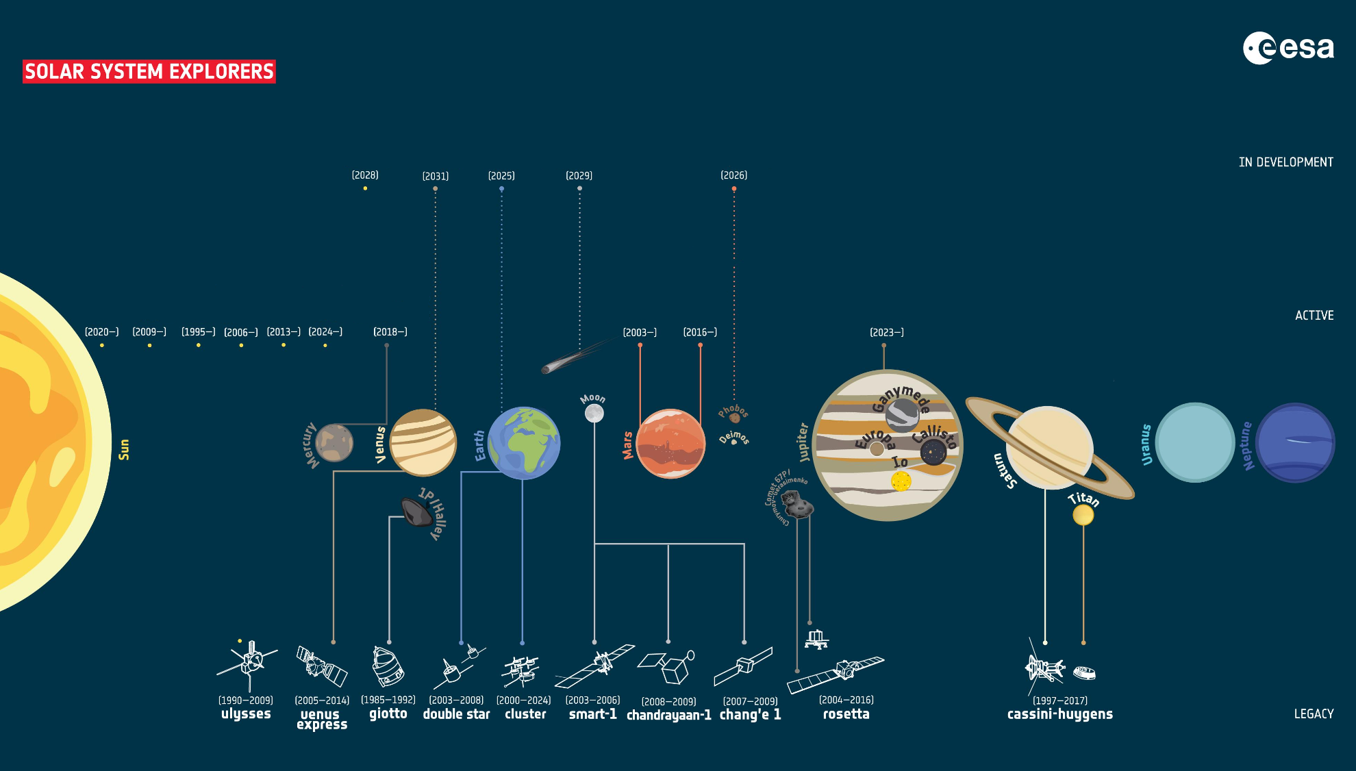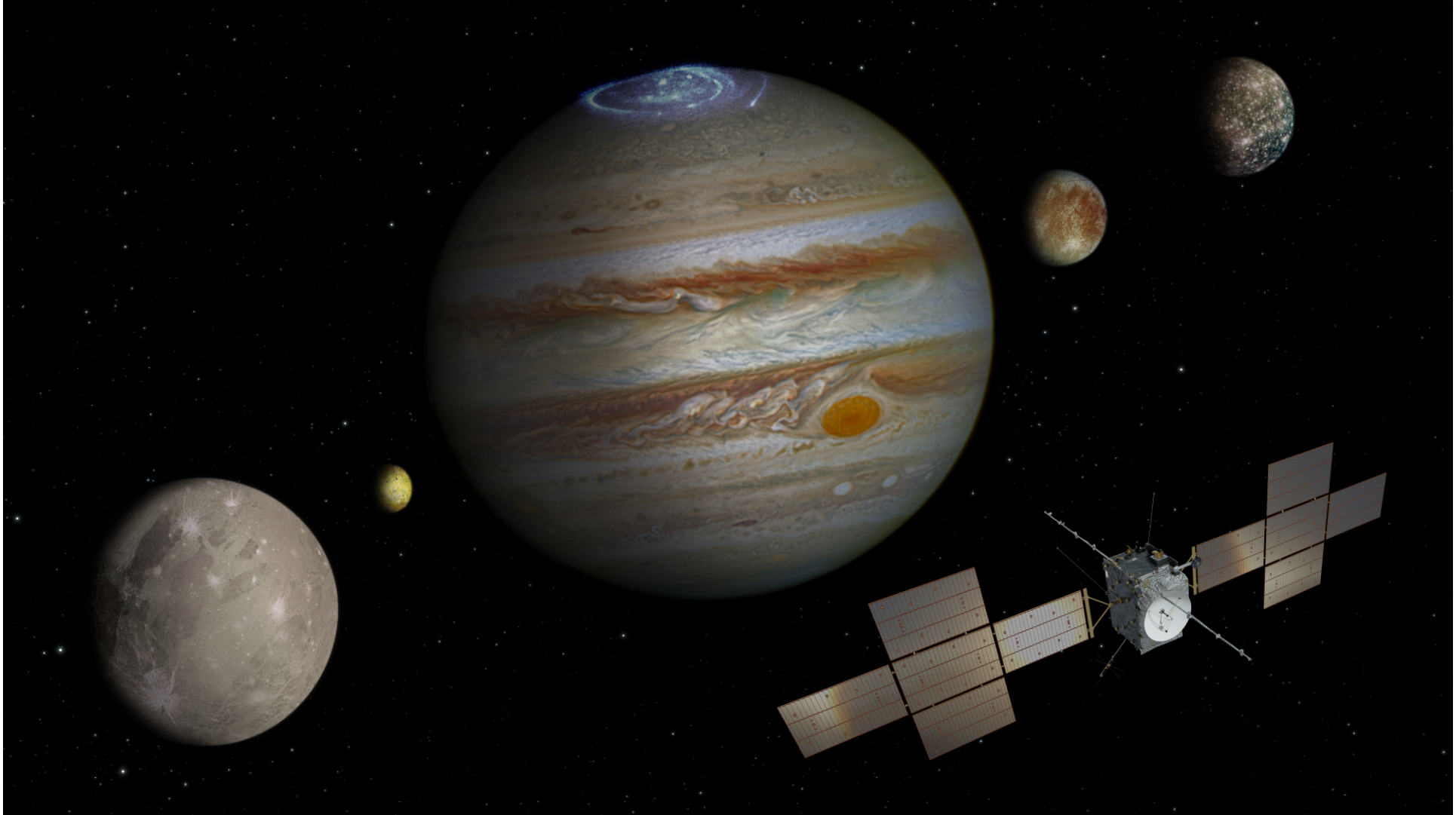 JUICE, lanzada por la ESA en abril de 2023, es la primera misión europea a Júpiter y sus lunas. Su objetivo es estudiar Ganímedes, Calisto y Europa, tres lunas que se cree que albergan océanos bajo su superficie. Será la primera nave en orbitar una luna que no sea la nuestra (Ganímedes), y buscará condiciones que puedan sustentar vida. Llegará al sistema joviano en 2031, tras varias asistencias gravitacionales.