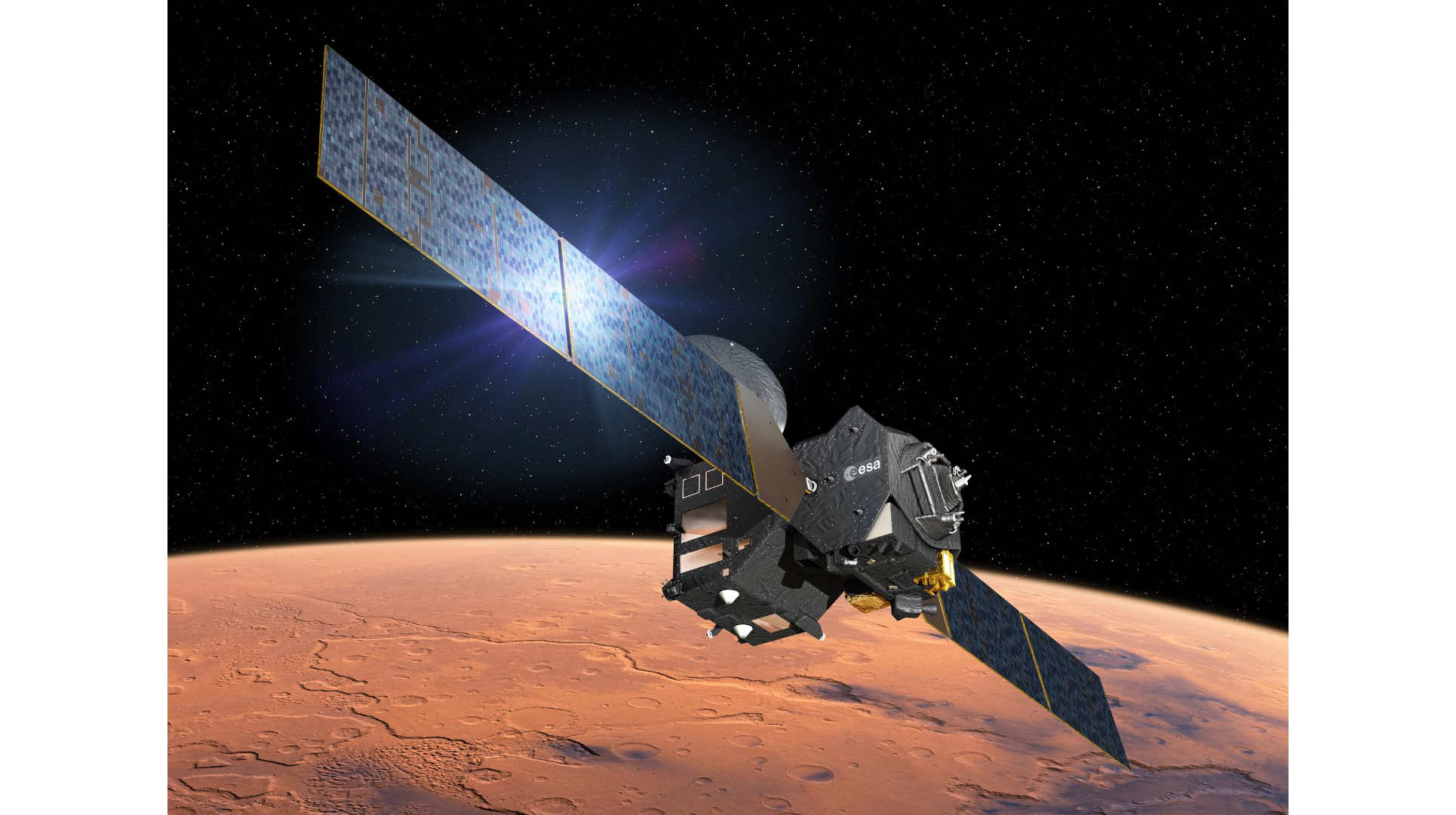 Mars Express orbita Marte desde 2003 y fue la primera misión planetaria de la ESA. Ha revelado pruebas de antiguos flujos de agua, hielo subterráneo y presencia de metano en la atmósfera. Sigue siendo una de las misiones a Marte más exitosas a largo plazo.