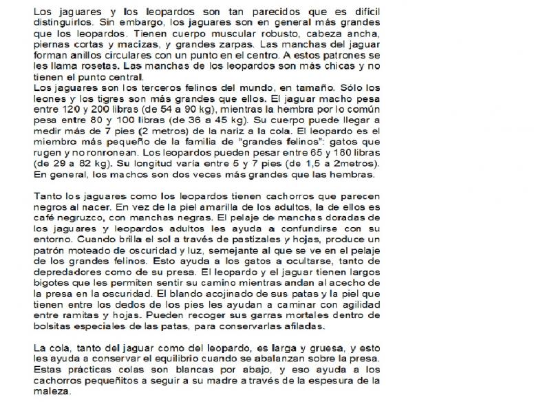 RESPONDER LAS PREGUNTAS DE LA 10 A LA 14 CON EL SIGUIENTE TEXTO JAGUAR O LEOPARDO. Según el texto, el jaguar y el leopardo se diferencian en