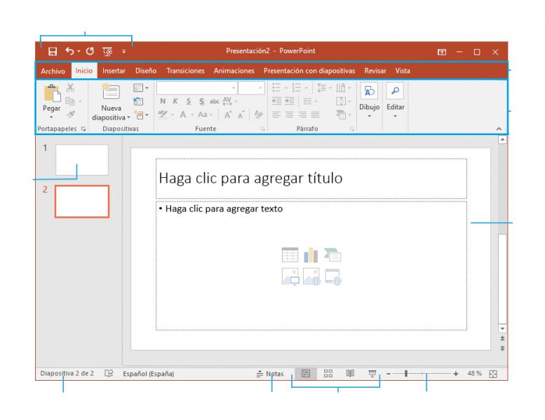 Actividad de la Interfaz de PowerPointVersión en línea Con esta actividad reforzarás los conocimientos sobre las partes que conforman la interfaz gráfica del programa para presentaciones Microsoft PowerPoint por Marysol Trejo 1 Barra de Herramientos de acceso rápido 2 Panel de navegación de diapositivas 3 Fichas de cada opción 4 Cinta de opciones 5 Panel de diapositivas 6 Número de diapositivas 7 Notas 8 Modos de visualización 9 Zoom 10 Marcadores de posición 11 Barra de Titulo 12 Botones de control 13 Diapositiva 14 Idioma del Teclado