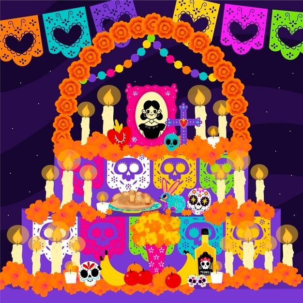 EL DIA DE MUERTOSVersión en línea "Pon a prueba tu ingenio y tu sentido del humor: las calaveras sonríen, las velas iluminan y el pan de muerto… ¡tiene más historia de la que imaginas!" por Sarahi Martinez 1 Papel picado 2 cempasúchil 3 fotografía 4 velas 5 pan de muerto 6 calaverita 7 fruta 8 bebidas Explicación 1 El papel picado representa el aire y la fragilidad de la vida, además de dar color y alegría a la ofrenda 2 El cempasúchil simboliza el sol y se usa para guiar a las almas con su color y fragancia hasta la ofrenda. 3 Las fotografías representa a la persona fallecida a quien se dedica la ofrenda y ayuda a recordarla con amor 4 Las velas simbolizan la luz que guía a las almas hacia la ofrenda 5 El pan representa la ofrenda de alimento para los difuntos y la ciclicidad de la vida. 6 La calaverita simboliza a los difuntos y sirve para recordarlos con alegría, mostrando que la muerte también puede celebrarse. 7 La fruta representa alimento para el espíritu y la abundancia de la vida. 8 Las bebidas simboliza alimento y bienvenida para las almas, ofreciéndoles fuerza y descanso.