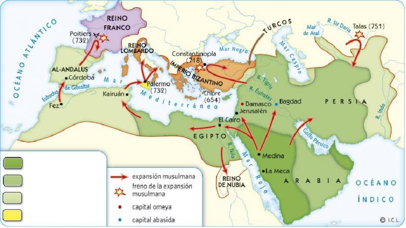 Expansión del Imperio Islámico en los diferentes califatosVersión en línea Sitúa en el mapa las diferentes etapas de expansión del Islam. por Elvira Garcia Arnal 1 Expansión hasta la muerte de Mahoma en el 632 2 Expansión al oeste en 632-661(Califato Ortodoxo) 3 Expansión al este en 632-661 (Califato Ortodoxo) 4 Expansión al oeste en 661-750 (Califato Omeya) 5 Expansión al oeste tras el 750 (Califato Abasida) 6 Expansión al este en 661-750 (Califato Omeya)