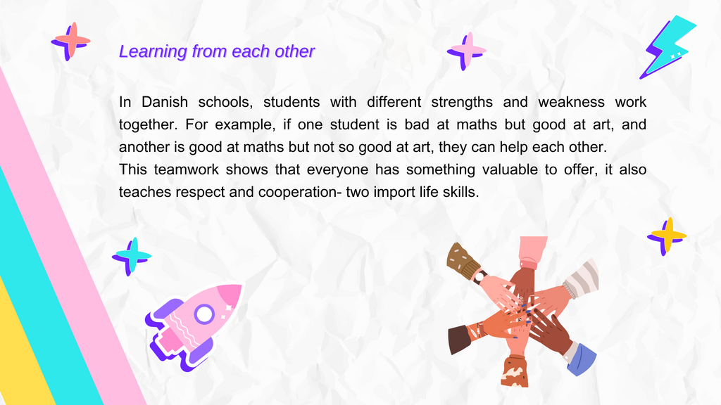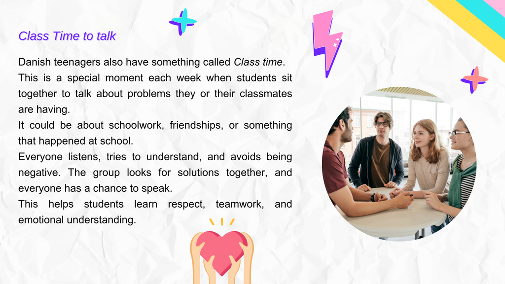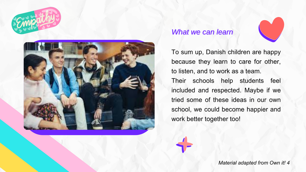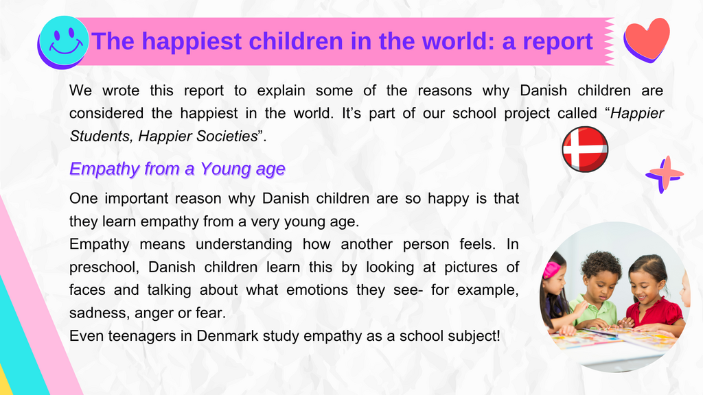 The happiest children in the world: a reportVersión en línea We've talking about happiness in different parts of the world, like in Bhutan. Denmark is one of the happiest countries in the world, according to some research. Read the article about why students in that country are the happiest. Then, read the questions and choose the best answer (A, B, C or D). You have 40 seconds to answer each question and 3 lives. Good luck! Click on the image next to the question to zoom in. por Maria Sol Manuli 1 What is the main topic of the report? a Why Danish schools are the most difficult in the world. b How to study empathy in Denmark. c Why Danish kids and teens are considered the gladdest. d 2 What does "empathy" mean? a Learning how to speak about emotions. b Being kind to animals and nature. c Try to ignore people's emotions. d Understanding and sharing another person's feelings. 3 How empathy is taught to young kids? a By playing different games. b By showing different faces and talking about feelings. c By reading children's books with a moral. d By studying different subjects. 4 What is "class time"? a It's a subject in which students can learn what they want. b It's a moment in which students can share what they are going through in their lives. c It's a time when students can study and help each other. d It's a time when students work on some projects. 5 What happens when students work together? a They learn to work collaboratevily and respectfully. b Students get good marks. c Students build long-lasting relationships. d They compete with each other to see who is the best. 6 What is the writer suggesting at the end of the article? a Denmark has the best educational system in the world. b Happiness can't be learned at school. c If other schools from different parts of the world put these ideas into practice, students would be as happy as students in Denmark. d Schools should focus more on students' happiness.