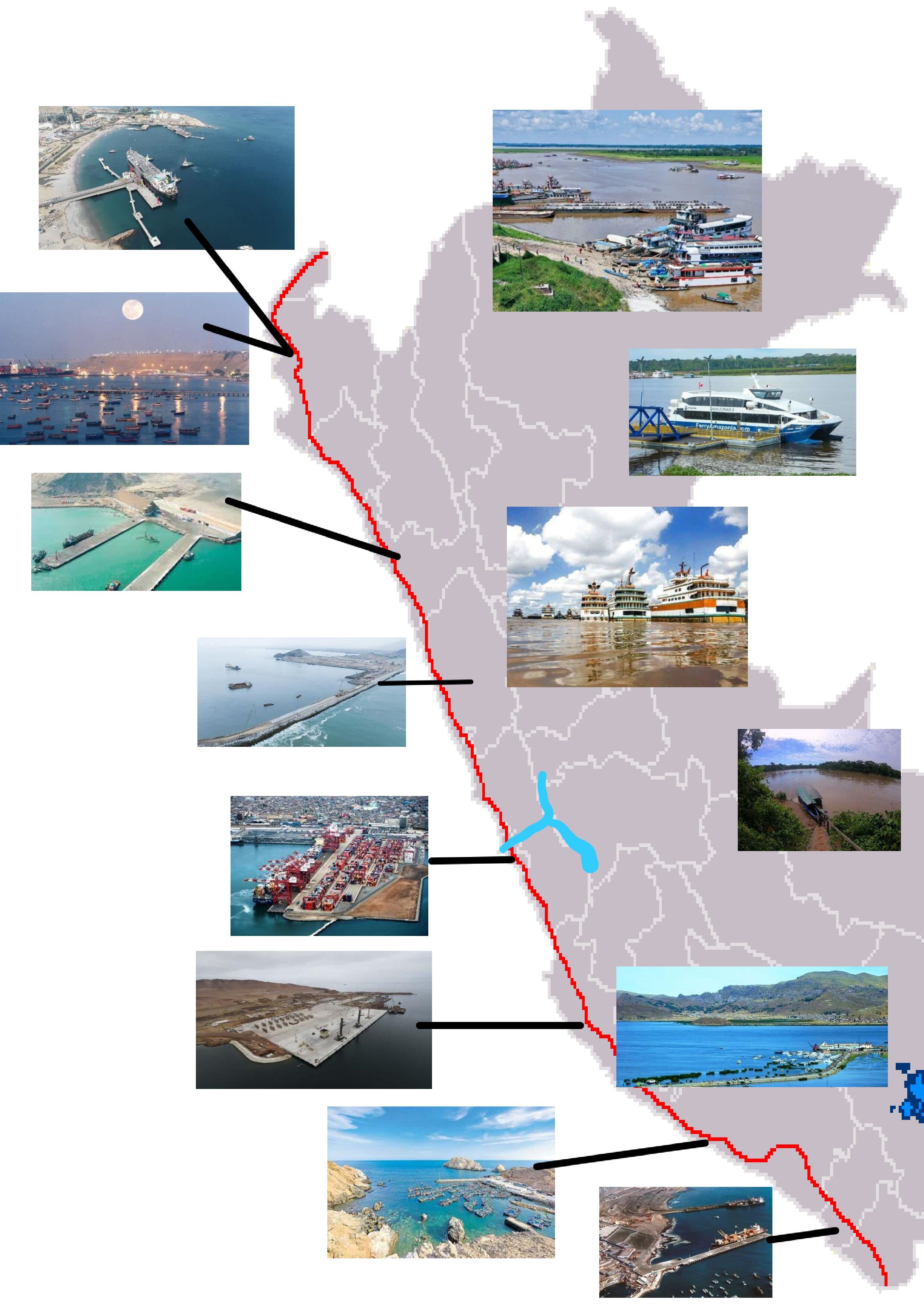 Puertos marítimos y Puertos fluvialesVersión en línea Puertos marítimos son las áreas de estación para el arribo, salida y descanso de barcos. Enorme flujo comercial: 95% del comercio exterior peruano. Los Puertos fluviales: Ubicados en la Selva Baja. Existiría hasta 50 mil kilómetros de red fluvial. por LEONARDO ENRIQUE VARGAS NUÑEZ 1 Puerto de Talara (Piura – Talara) 2 Puerto de Paita (Piura- Paita) 3 Puerto de Salaverry (La Libertad – Trujillo) 4 Puerto de Chimbote (Ancash) 5 Puerto de General San Martín (Pisco). 6 Puerto del Callao 7 Puerto de Matarani (Arequipa – Islay) 8 Puerto de Lacustre 9 Ilo (Moquegua) 10 Puerto fluvial de Iquitos (Loreto) 11 Puerto fluvial Caballococha (Loreto) 12 Puerto fluvial de Pucallpa 13 Puerto fluvial de Contamana
