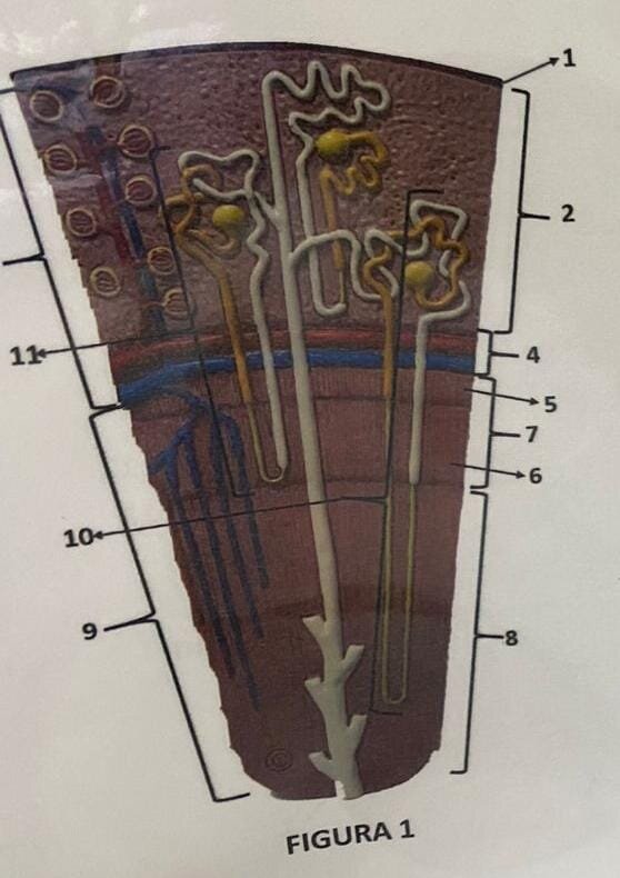Modelo do cortex e medula renalVersión en línea Histologia renal por Mariana Maria 1 cápsula 2 Córtex externo 3 Córtex justaglomerular 4 Medula externa 5 Medula interna 6 Medula 7 Néfron justaglomerular 8 córtex 9 Nefron cortical 10 Faixa interna da medula externa 11 Faixa externa da medula externa