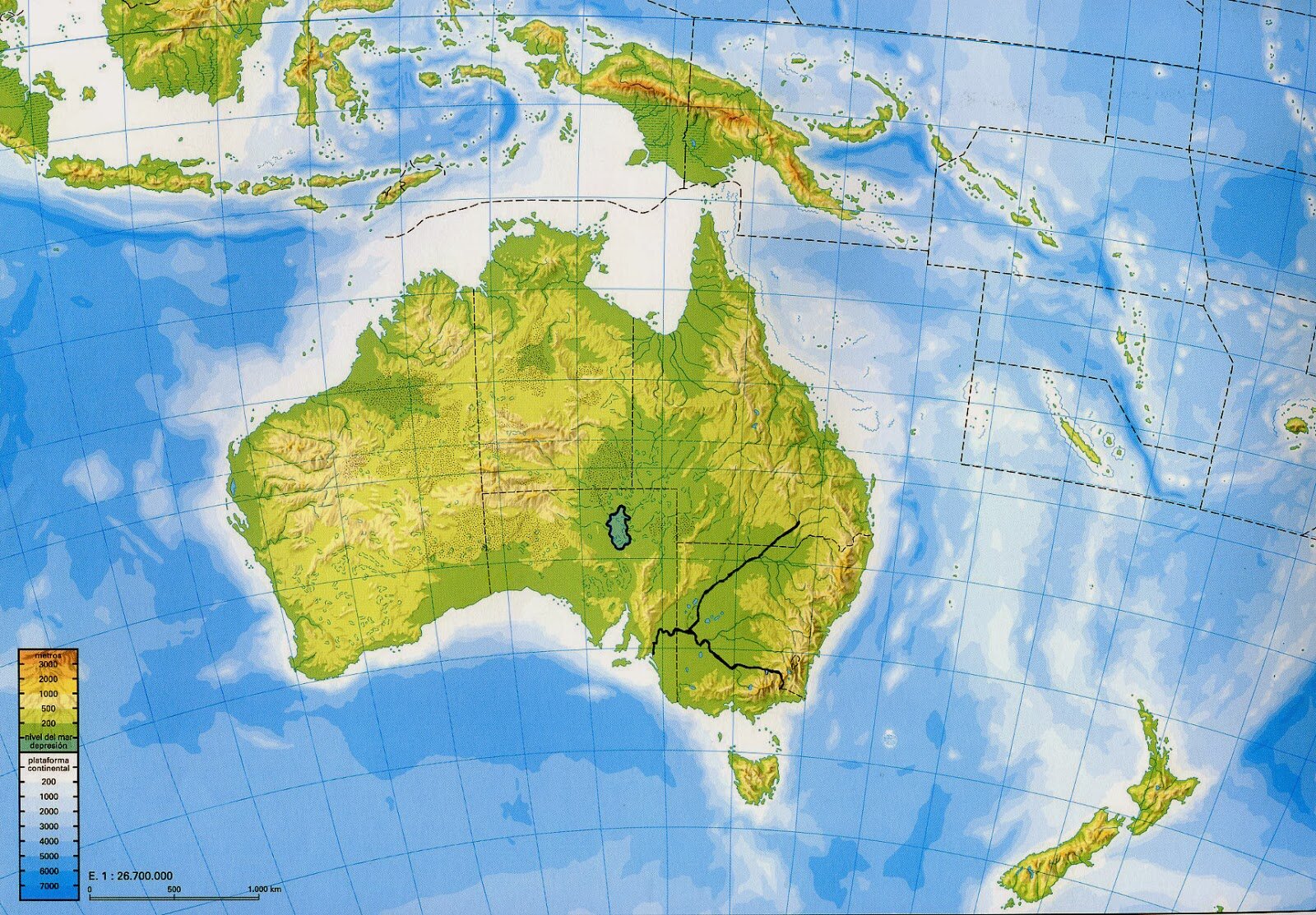 Mapa Físico Oceanía SJBVersión en línea Relieve por Adrian Raptor 1 río Darling 2 Río Lanchlan 3 gran cordillera divisoria 4 Alpes Neozolandeses 5 pico jaya 6 ARENA 7 desierto Victoria 8 Océano Índico 9 océano Pacífico 10 mar de Tasmania 11 mar de coral 12 mar Timor 13 Gran Bahía Australiana 14 Cabo Arnhem 15 Cabo York 16 Estrecho Cook